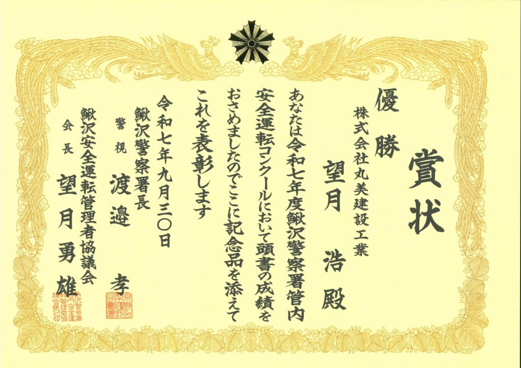 令和7年9月30日㈫ 峡南自動車教習所において、鰍沢警察署及び鰍沢安全運転管理者協議会主催による安全運転コンクールが開催され、弊社工事部 望月 浩 が優勝を受賞しました